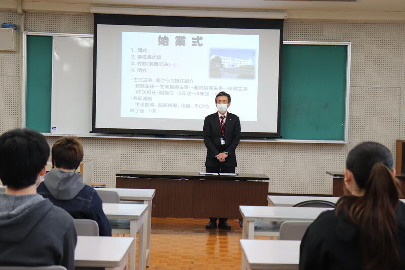 新入生の入学式を終えた後、夕方5時過ぎから在校生の登校が始まりました。今年度最初の登校日は、まず転入された先生方をお迎えする新任式から始まりました。今年度は新しく2名の先生をお迎えします。生徒会長の井上さんが先生方に歓迎の挨拶を述べました。また、その後行われた始業式では校長先生から式辞を頂き、続けて新しい主任主事の紹介、担任・副担任発表や諸連絡がありました。