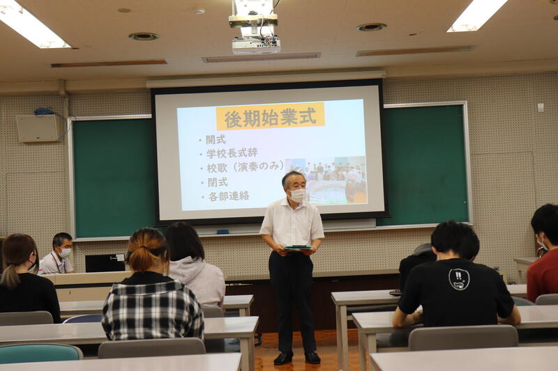 本日は、視聴覚教室で後期始業式が行われました。学校長講話では、学校に通う意義を書籍を通じて話をされました。就業している生徒が7割を超える定時制の生徒たちは、多忙な日々を送る中で、頑張って通学することの大切さについて改めて考える貴重な時間となりました。その後、校歌を全員で黙聴後、諸連絡があり終了しました。