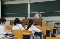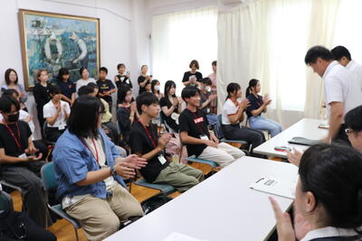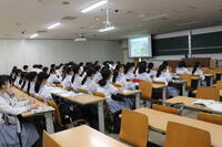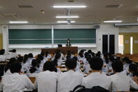 九大では、工学部・工学研究院化学工学部門の井嶋博之教授から特別模擬講義をしていただき、九州大学で学べる幅広い研究分野のことや、井嶋教授の最先端の研究について分かりやすく紹介していただきました。玉名高校卒業の井嶋先生が後輩たちに向けてしてくださったお話は、温かくやさしい語り口ながら、生徒たちの知的好奇心を刺激する興味深い内容で、50分という予定時間があっという間に過ぎてしまいました。