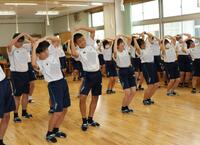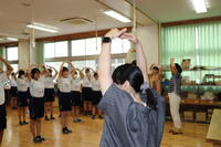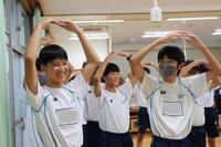 初回は、熊本市の劇団「転回社」から5人の劇団員の方を講師としてお迎えし、クラスごとに2時間のワークショップをしていただきました。出されたお題をイメージして即座に自分の体を使って指定された「モノ」になりきる、というなかなか慣れない身体表現活動に初めは戸惑う様子もみられましたが、表現することの奥深さと楽しさを実感できた3年生でした。次回の研修も楽しみです。