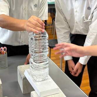生徒たちは2~3人で一つ、ケント紙で全長25cmのペーパーブリッジの試作用を組み立て、2Lの水が入ったペットボトルを載せる耐荷実験をしました。ほとんどの作品がしっかりと保ち、生徒たちも薄いケント紙が組み立て方によって強度を強くすることにびっくりしていました。慣れてくるとどんどん負荷を増やし、いつ、どこで壊れるかを大盛り上がりで実験をしました。