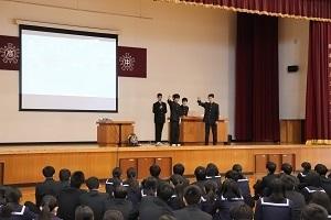 その後、教務主任から、「3学期は次に向けた0学期と捉え、しっかりと準備すること。授業で学んだことは実際に確認することで学力が深まる。」、進路指導主事から、「どうしてもなりたい、という気持ちを大事にできる者の夢は叶う。やる前にやらない理由を探さない、結果が全てだから、一つずつ確実にチャレンジすることが大切。」、生徒指導主事からは、「アスリートがレベルアップするために環境を整えること=校則と捉えられる。本校においては、進学するための環境整備が校則だと解釈しよう。」という話をいただきました。