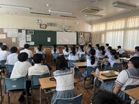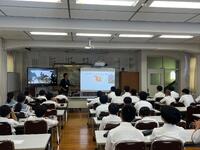 学年主任の仲山先生からスライドで4月からの入学式、体育祭、宿泊研修等、写真を見ながら1学期の振り返りをしました。すでに4月と7月現在の生徒たちでは顔が随分と大人びたと感じました。