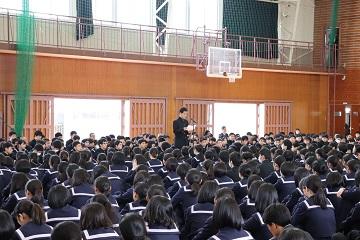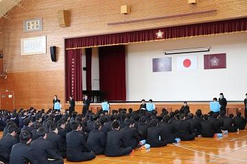 4月9日(火)、対面式が行われました。在校生を代表して、生徒会長の谷口君から歓迎の挨拶があり、新入生を代表して附属中の木下さん、高校の森くんから、それぞれ力強い決意の言葉が返されました。