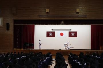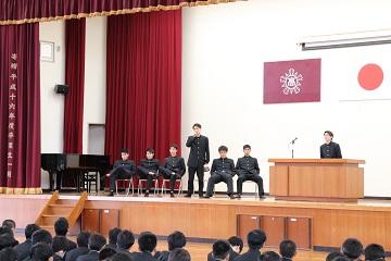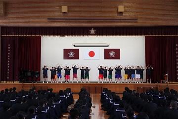 各団のリーダー・スタッフの紹介や応援団長からのスローガン発表、附属中学校の応援団員の紹介がありました。