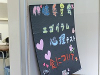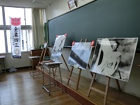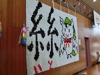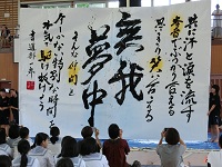体育館では、書道部による書道パフォーマンスとギター部の演奏がありました。なお、書道パフォーマンスの作品は、体育館後方に展示しています。また、同じく体育館後方には、ペットボトルのふたで作った玉高・附属中キャラクター「わかごまる」のモザイクアートも展示しています。