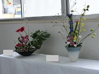 クラスや部活、委員会の企画は、どれもたくさんの人出。一方、第1棟と第2棟の渡り廊下に展示されている華道部のお花には、癒やされます。