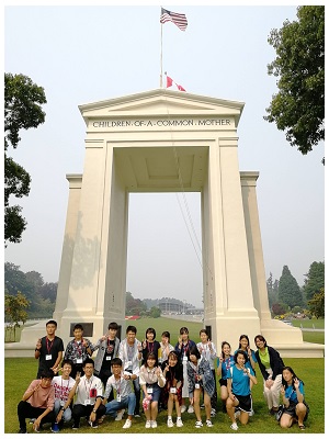 日本では見ることのない陸続きの国境と広い芝生にテンションも上がり、元気のある男子は走り回っていました。国境線をまたいで写真を撮ったり、アメリカへ行った気分になったりと、とても楽しそうでした。(カナダとアメリカの国境線上には、写真のように、白亜のアーチが建てられています。)