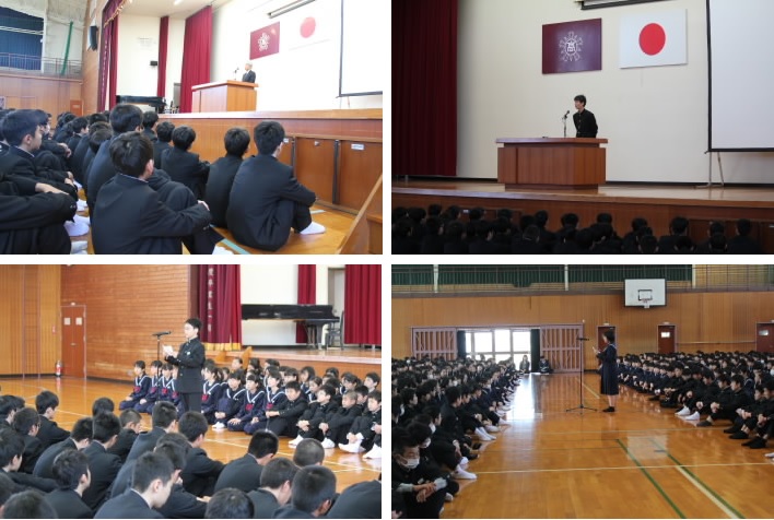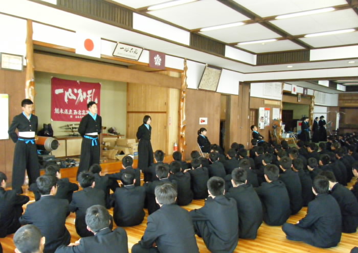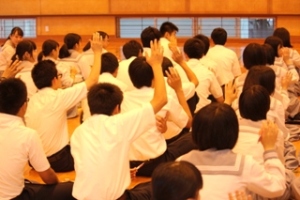 続けて行われた激励会等で、校長先生からは、「今年の体育祭のテーマは『創駆再生~小さな輝きを大きな感動へ~』でしたが、今度も選手が一つになり輝いてください。運動部はもちろん、文化部も直前まで、金栗四三さんの言葉、『体力、気力、努力』を唱え、自分自身で不安を吹き飛ばしてください。出場する本人はもちろんですが、応援するみんなが誇りを感じるような試合や演奏、合唱、演舞をお願いします。最後に、校歌の歌詞にある『久遠の理想をきわめん』という強い意志で頑張ってください。」と話されました。