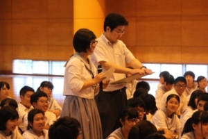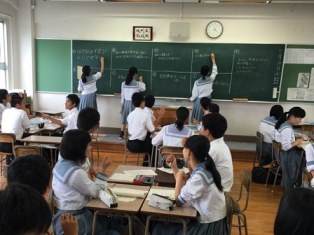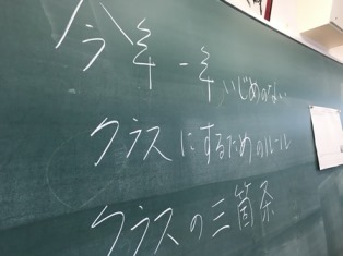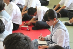 1年生では「いじめの構造」というテーマで、いじめが始まる理由やいじめが起きやすいクラスの様子などについて考え、最後にいじめを起こさないためのクラスのルールとして「クラスの3箇条」を話し合いました。班ごとに皆真剣に取り組み、意見を交換をする姿が見られました。自分のそれまでの体験を共有したり、具体的に細かい行動について話し合いをした班もありました。その後、班ごとの意見をまとめ、「クラスの3箇条」を作りました。この3箇条を一人一人が守りながらよりよいクラスにしていきたいです。