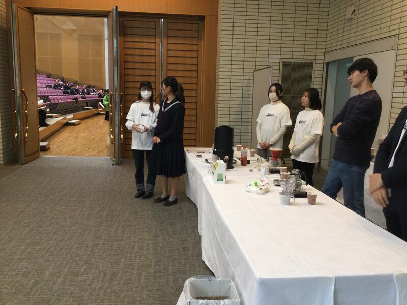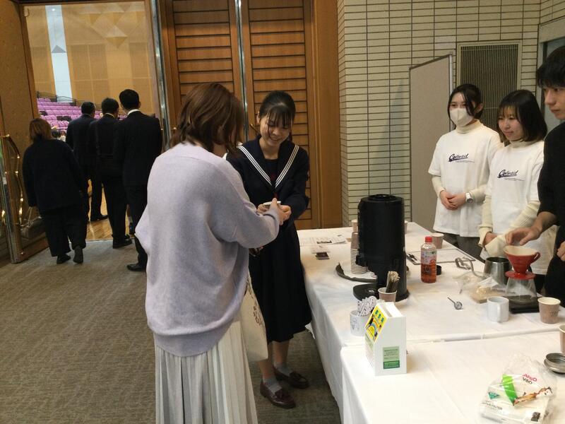 この期間の初日に当たる11月25日(土)に、ホテル熊本テルサで上記のシンポジウムが開催され、生徒会2年生の木下さんが参加しました。木下さんは熊本大学の犯罪被害者支援大学生ボランティア「くすの輪」およびコーヒー研究会の学生の皆さんと一緒に、来場者の方々にコーヒーを無料提供するボランティア活動を行ったほか、本校の創立120周年記念のTAMACOFFEE製造にご協力いただいたカーメストコーヒーショップの深迫祥子さんの講演会にも参加しました。