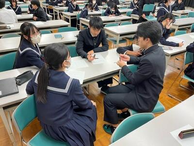 今回は、生徒会主催で魅力的な学校づくり(中進生と高進生のかかわり)についてグループトーキングとシェアリングをしました。
