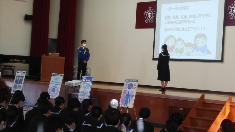 11/29(水)に高校1、2年生を対象とした薬物乱用防止講演会が行われました。玉名警察署の谷尾貢 様より、違法薬物が与える様々な影響、若者にも広がる違法薬物の現状などを話していただきました。また、知らない人に会いに行かない、画像を送らない、など犯罪につながる行動を行わないように、SNSの使用についてのルールを再確認しました。生徒からはオーバードーズについての質問が出ました。薬物についての正しい知識を知り、違法薬物に関わることがないように活かしてほしいと思います。