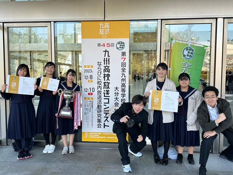 12月8日(金)~10日(日)にかけて、大分県別府市で第7回全九州高等学校総合文化祭大分大会放送部門 第45回九州高校放送コンテスト大分大会が開催されました。本校放送部は朗読(県大会3位)・ラジオ番組(県大会3位)・テレビ番組(県大会優勝)の3部門で熊本県代表として参加してきました。このうち、聴覚過敏について訴えたラジオ番組とTAMACOFFEEの取り組みについて取り上げたテレビ番組が、それぞれ各県の代表である40作品中の上位10作品の中に選ばれ決勝に進出しました。そして決勝では、ラジオ番組が見事優勝し九州の頂点に立ちました。また、テレビ番組も4位に相当する優良賞を獲得しました。