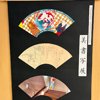 美術の展示も書道の簡易掛け軸の作り方を教わり、新しい方法をチャレンジしました。台紙の上下を細長い角材で挟む方法です。テープや画びょうを使えないパネルの展示に最適でした。