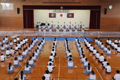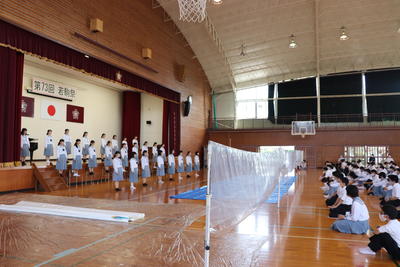 「 玄 ~暗がりに耐え、明日を照らす先駆者~ 」をテーマに、第73回 若駒祭がスタートしました。コロナ禍の真っ只中にあり、感染対策として会場の”密”を回避するために四日間に渡っての日程で実施します。1日目は中学生の観覧日になっており、各教室で玉校生クイズを行った後、メインステージ(第一体育館)に移動して、保健委員会が制作した動画の上映、音楽部の合唱、書道部によるパフォーマンスが行われました。サブステージ(第二体育館)では、有志によるバンドやダンスが行われました。
