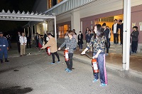 避難後は、消火器の使い方の説明を聞き、水消火器を使って訓練をおこないました。最後は、体育館に移動し、避難訓練の講評と熊本地震についての講話を聞きました。熊本地震から約2年半。少しずつ薄れゆく記憶のなかで、当時の救護活動の様子を写した何枚ものスライドを観て、再びあのときの記憶が蘇ってきました。講話の最後には「今後も必ず大きな災害が起きるはず。熊本地震を経験した私たちは決して忘れてはいけない。人とのつながりを大切に生きてください。」と消防隊員の方から熱いメッセージをいただき、生徒みんな真剣に聞き入っていました。