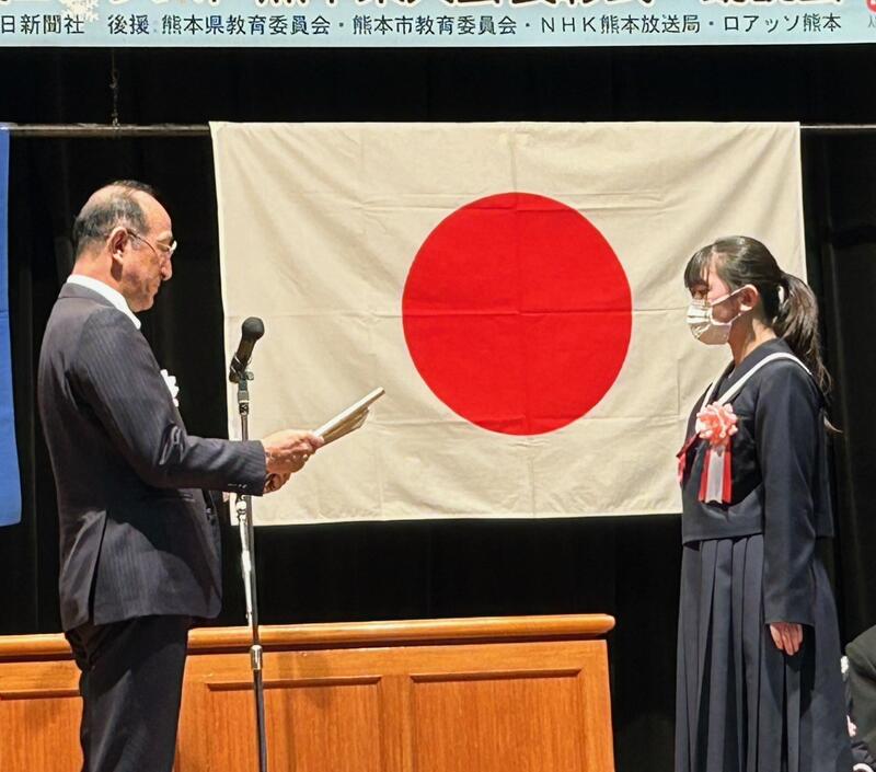 1年生の吉村さんが、全国中学生人権作文コンテスト熊本県大会で特別賞(熊本県教育委員会賞)を受賞しました。