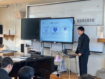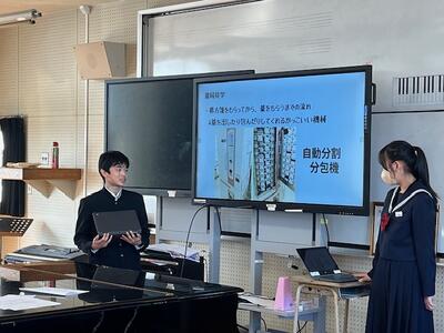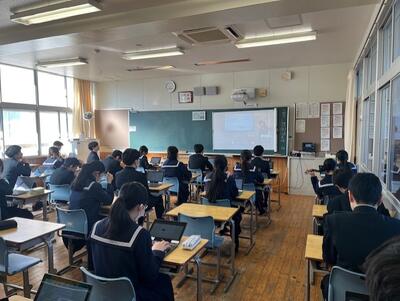 本日1限目は、1年生と2年生は合同で総合的な学習の時間でした。2年生が、1年生に対して、11月に実施した職場体験の発表会を行いました。医療、教育、公的機関、飲食、メディアの各分野について、学年から選ばれた生徒たちが1年生にプレゼンテーションを行いました。クイズを取り入れたり、笑いを誘うエピソードを挿入したりして、1年生が興味をもって聞いてくれる工夫を凝らした発表でした。1年生も次年度の自分たちが職場体験をするイメージを描いて、集中して聴いていました。