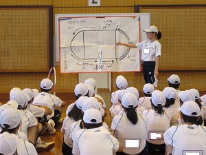 今日は、技巧走と大縄の競技説明を行いました。体育委員長の指示の下、グループに分かれ、生徒会執行部から説明がありました。技巧走は、フラフープや4人5脚、積み重ねた段ボールをもって走るなどの競技を行いながら、リレー形式でグラウンドを一周します。また、大縄は24人1チームで2分間で何回飛べるかを競います。大縄は難易度が高く、リーダーによるデモンストレーションもなかなかうまくいきませんでした。これから、本番に向けて各団で作戦を練って、練習をしていきます。