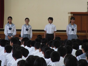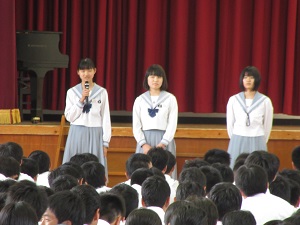 高校総体総文祭・中体連・夏のコンクールなどの激励会を、中高合同で行いました。中学生の部長も全校生徒の前で、部活動ごとに意気込みを述べました。各種大会まであと1ヶ月。中学3年生は、自分の力を出し切り、悔いのない大会にして欲しいと思います。中学1、2年生も先輩と部活動ができるのもあとわずか。先輩の背中をしっかりとみて、先輩と共に最後の大会を戦って欲しいと思います。