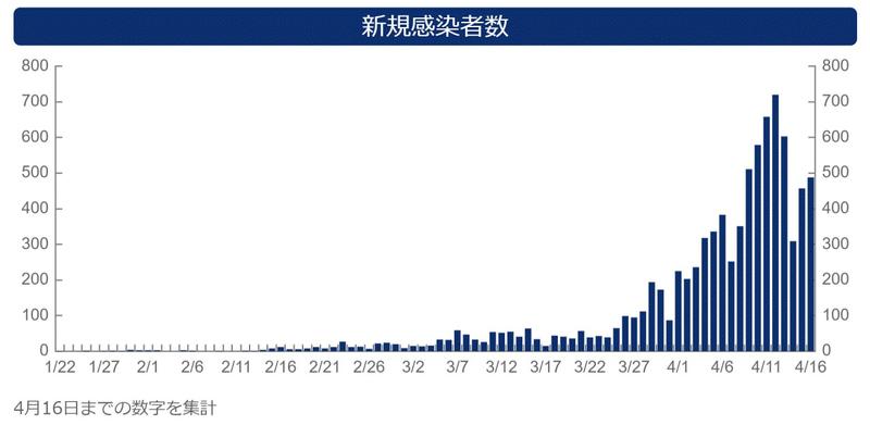 次のグラフは、日本の「1日あたりの感染者増加数」のグラフです。東京では外出自粛を呼びかけ始めて2週間以上が経ち、感染増加のピークを過ぎたようにも見えますが、外出自粛が徹底されていたわけではないので油断できません。全都道府県に「緊急事態宣言」が出されたことで、全ての国民の危機意識が高まることを期待しています。