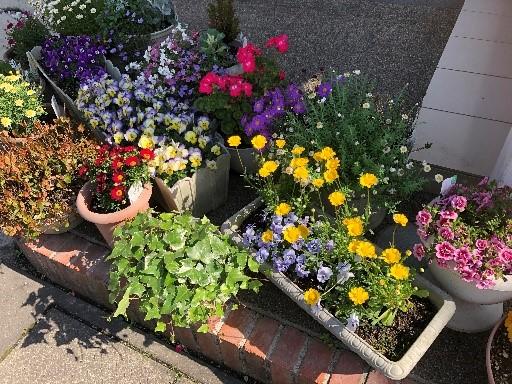 今回は、「花植え」をおすすめします。下の写真は我が家の玄関に置いている花ですが、昨年の秋から冬に植えたものです。中には、毎年ピンク白の葉をつけてくれる初雪カズラや奇跡的に冬を越したペチュニアもあります。現在とてもきれいに咲いてくれています。時間がある今こそ花を育てる楽しみを味わってみませんか。