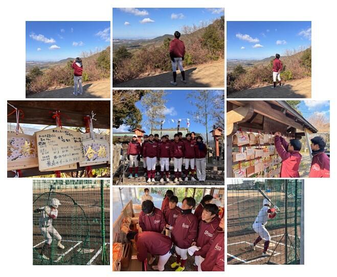 この日は玉名の氏神様にあたる疋野神社へ必勝祈願へ行きました。その後、一願成就などで有名な蓮華院誕生寺奥ノ院の展望所で各選手、マネージャーが今年一年の抱負を述べました。昼食には保護者会より豚汁などの提供がありました。新年のお忙しい中に準備していただき感謝しております。午後の練習では連続ティー、フリー打撃などのバッティング練習を行いました。