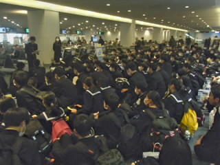 受付ロビーは多数の学校の修学旅行生で満杯です。)