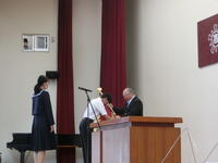 最初に、高校生は陸上部主将の伊達君へ、中学生は生徒会長の百田さんへ校長先生から校旗が授与されました。