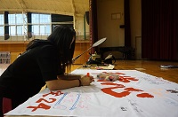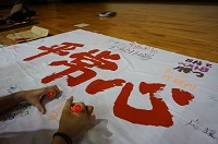 今回は、定通総体に向けて、練習以外のことを紹介したいと思います。写真は、昨年度から作成を始めた応援旗です。絵を描くことが得意な3年次田中さんが、今年度も書いてくれました。また、今年は2年次生が書道の授業で、もう一枚「平常心」と書かれた旗を作成して、皆で寄せ書きをしています。「平常心」には、試合中に相手のペースに惑わされず、自分らしく戦えるようにとの思いが込められています。また寄せ書きには、全国大会出場、ベスト8などの個人的な目標や、仲間を応援するメッセージが書かれています。最後の写真は、頑張っている生徒たちを応援しようと、社会科福永先生が生徒たちにスイカの差し入れをくださいました。休憩時間や練習が終わった後、おいしくいただくことができました。定通総体まで残り1週間となりました。限られた時間を有効に活用して、練習の成果を出し切れるように頑張っていきましょう!