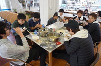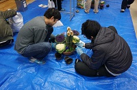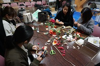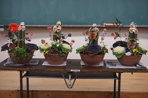 12月20日(木)班別活動のクリエイティブ班では、「お正月を迎える準備をしよう!」ということで、門松としめ縄作りに挑戦しました!門松は、男子の担当です。丸いプランターに竹を挿し、葉ボタンやパンジーなどを植え、周囲を飾り付け。しめ縄は、女子が担当しました。古いしめ縄から飾りをはずし、100円ショップで購入した造花や飾りをグルーガンでつけたり、針金で巻き付けたりして完成です。「ここには、この飾りが・・・」「ちょっとおかしいかな・・・」など、それぞれが創意工夫をこらして完成させました。
