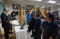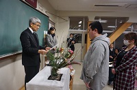 今年最後の生徒集会。机上にある花は、事務の先生が季節に合わせていつも用意してくれます。集会のおまえに表彰式を行いました。10月に熊本県定時制通信制文化大会で生活体験作文を発表した本多さんや、今年度のがんばる高校生として表彰された髙木さん、11月のスポーツ交流会(ボウリング大会)で個人優勝を果たした大谷さん、様々な検定試験に挑戦し合格した皆さんを表彰しました。
