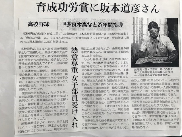 玉名高校定時制教頭坂本先生が、高校野球の発展と育成に尽くしたということで、日本高校野球連盟と朝日新聞社が表彰する「育成功労賞」を受賞されました。