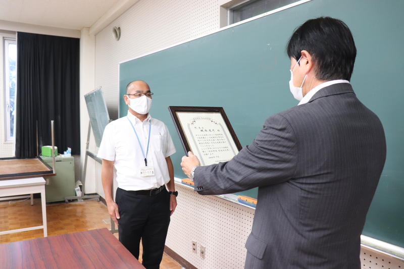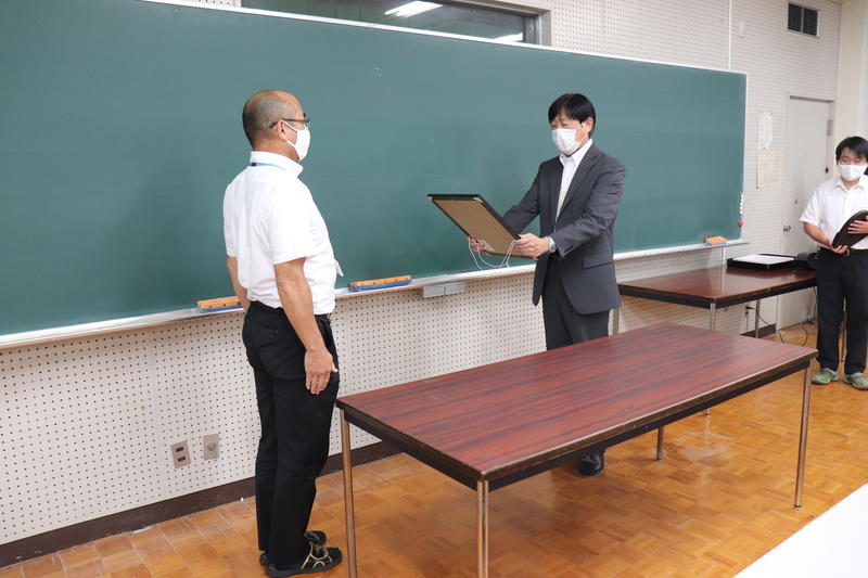 9月25日(金)始業式の前に、坂本教頭先生のご功績を西澤校長先生がご紹介され、表彰式が行われました。