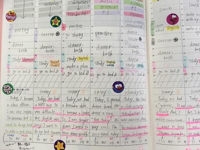 週末に楽しんだこと、学校で疲れて早く寝たこと、宿題をがんばったこと。2年生になって未来形を勉強しました。すると週末の予定や自分の意志をbe going to やwill を使って書いてくるようになりました。