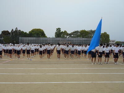 予行練習開始早々、まさかの雨。入場行進を終えた時点で、生徒は教室待機となりました。わずかな時間でしたが、全校生徒がグランドに並び、行進する姿をみることができてうれしくなりました。