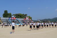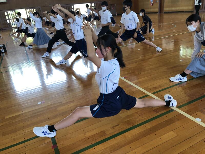 全体での予行練習は延期となり、室内での団別練習。中学生は、雨が上がった11時過ぎからグランドで、ダンスと演舞を練習しました。今年度、無事に開催できることを心から願っています。
