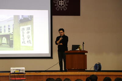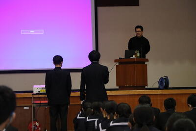 2月13日(月)の3,4時間目に木村達哉氏を講師にお招きし、講演会を行いました。木村達哉氏は、元灘中学校・高等学校の英語科の教師で、生徒たちが普段使っている「夢をかなえる英単語」通称「ユメタン」の著者です。ご自身の人生を振り返りながら、「何のために勉強するのか」「英語の勉強方法で大事なこと」などユーモアたっぷりでお話をされました。生徒は、「話がとてもおもしろかった」「勉強する意味が分かった」「今日習ったやり方を実践しようと思った」等、前向きな感想ばかりでした。