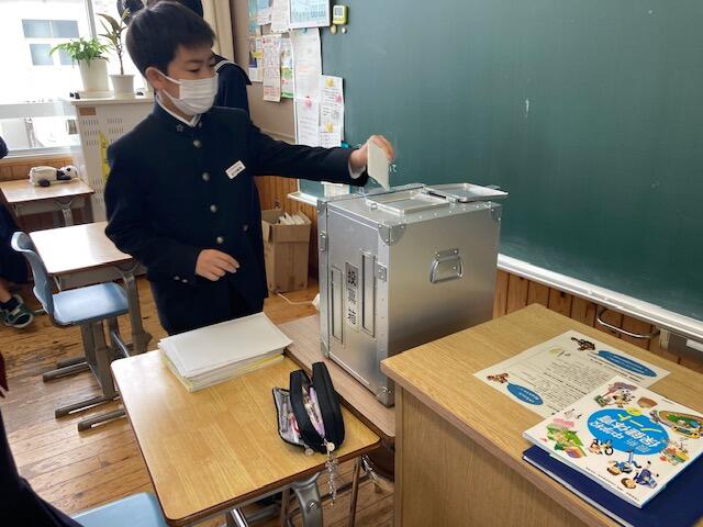 新生徒会役員の選挙を12月5日(火)に行いました。今年度は生徒会長に5名、副会長男子2名、副会長女子3名、2年生書記男子4名、2年生書記女子2名、1年生書記男子1名、1年生書記女子4名、総計21名の立候補がありました。選挙当日に向けて、朝からは立候補者が挨拶運動を行い、昼食時には意気込みを放送し、掲示板にはポスターや公約などを掲示しました。投票日当日は、立候補者による討論会を行いました。また、投票箱は玉名市の選挙管理委員会から実際に使われているものをお借りして行いました。どの候補も、しっかりと考えて意見を言っており、あっというまに時間となりました。当選した生徒はもちろん、立候補したすべての生徒がこれからリーダーとして学校を引っ張て行く存在になってくれると思います。