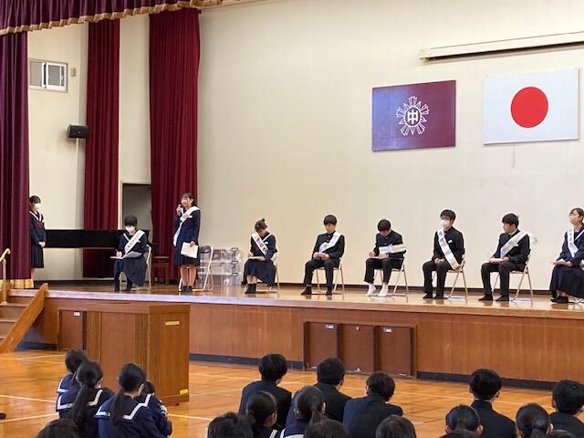12月21日(木)に生徒会執行部認証式が行われました。まず、新生徒会役員に選ばれた生徒に、校長先生より一人ずつ認証状が手渡され、激励の言葉をいただきました。その後、新生徒会長が代表して新生徒会としての決意を述べました。生徒会の生徒たちを中心として、生徒たちが主体的に玉名高校附属中学校をより一層素敵な学校にしてくれることと思います。