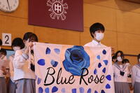 学級目標は「Blue Rose」。青い薔薇には、「不可能を可能にする」という花言葉があります。2年A組も不可能を可能にできるクラスにしたいです。学年カラーである青も、意識しています。学級旗は、学級目標である「Blue Rose」をイメージしてデザインしました。花を持っているのは担任の林田先生の手で、そのまわりの花びらは35枚あって、クラスのみんなを表しています。大きさや形、色を揃えず、バラバラにして個性を表しています。(薔薇だけに!)