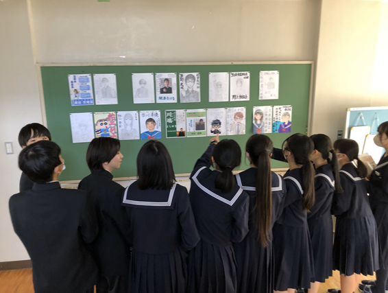 立候補者のポスターが出そろい、掲示板に掲示されています。リアルな似顔絵、写真、イラストを使ったもの等、アイデアを凝らした力作が並んでいます。生徒たちはインパクトのあるポスターを興味津々で見ています。