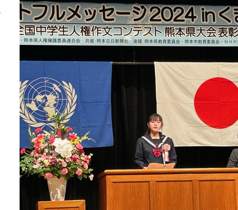 1年生の吉村さんが、全国中学生人権作文コンテスト熊本県大会で特別賞(熊本県教育委員会賞)を受賞しました。