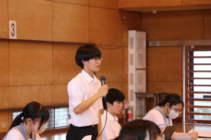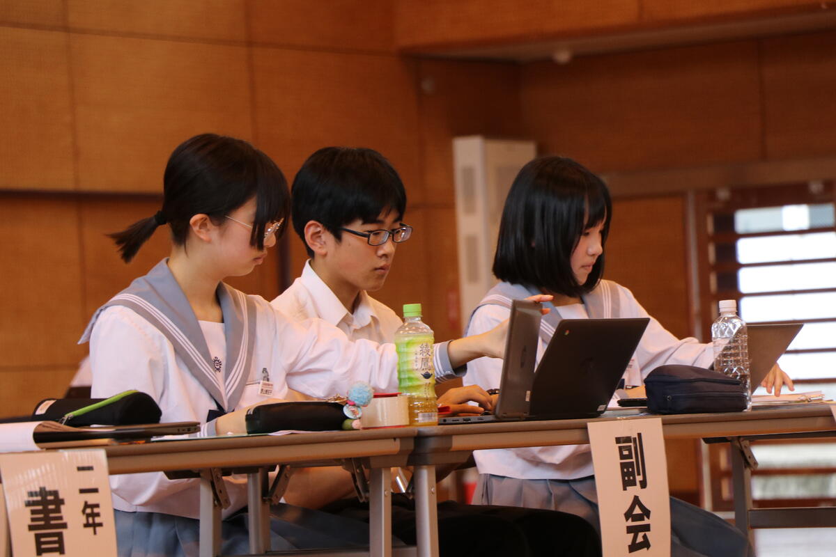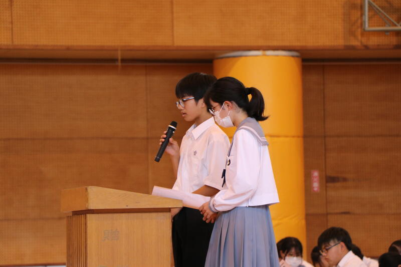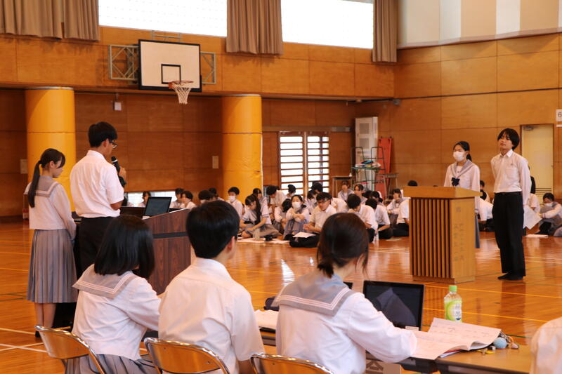 事前に各委員会の年間計画を確認し、生徒会執行部の議案についてクラスで話し合いをして生徒総会に臨みました。本番では各クラスの代表が質問やクラスの考えを発表しました。個人の質疑の時間には、よりよい企画や運営になるように、それぞれが意見を出し合い、一生懸命話し合いました。みんな真剣に聴いていて、有意義な会になりました。