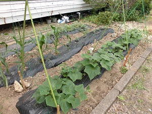 第1棟と第2棟の間に、生徒と一緒に小さな畑を作りました。数は少ないですが、キュウリ、オクラ、とうもろこし、ゴーヤを育てています。すくすく育っています。野菜を作ってみると、雨の必要性も理解が深まりました。