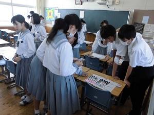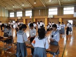 高校1年生の教室へ入った中学1年生は、どことなく緊張していました。高校1年生は、自分たちが経験してきたことでもあり、とても慣れた様子で対応してくれました。