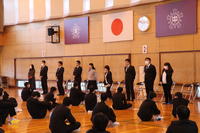 生徒たちは新型コロナウィルス感染拡大防止のために全員マスクを着用し間隔を空けて並んでいます。