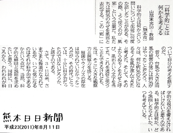 次の新聞記事は、東日本大震災の後に熊日新聞に投稿したものです。このときに感じた思いを書いたものですが、最近また読み返しています。