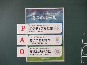 総学を進める際の合い言葉は〝P・A・O〟です。Pはポジティブ・フィードバック(ポジティブな反応)、Aはアクティブ・リスニング(相づちを打つ)、Oはオーバー・コミュニケーション(反応は大げさ)にです。